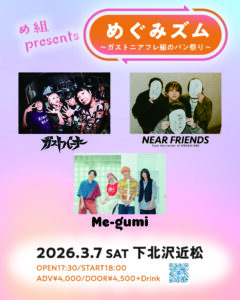 ■日時:2026年3月7日(土) OPEN17:30 / START18:00 ■会場: 東京・ 下北沢近松 ■出演 め組 / ガストバーナー / ニアフレンズ ■チケット 前売¥4,000(税込・ドリンク代別) イープラス チケットぴあ ローソンチケット お問い合わせ:HOT STUFF PROMOTION 050-5211-6077